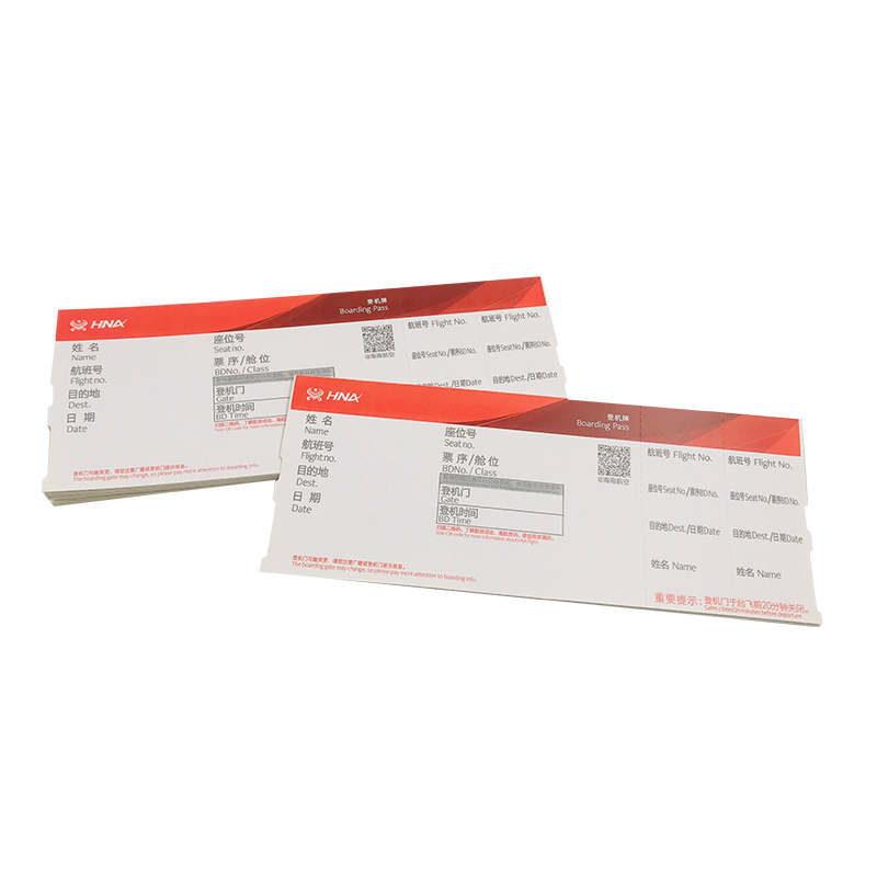 व्यावसायिक निर्माता म्हणून आम्ही आपल्याला बोर्डिंग पास तिकिटे प्रदान करू इच्छितो. बीपीए फ्री, एफएससी प्रमाणित, उच्च ग्रॅम थर्मल पेपर, सिंग/डबल कोटेड (सामग्री: बाकीआंग टीसी मालिका), पुनर्वापर केलेले पेपर, इको-फ्रेंडली प्रगत मुद्रण तंत्रज्ञान, दोलायमान रंग आणि स्पष्ट मजकूर प्रदान करणे वॉटरमार्क, होलोग्राफिक प्रिंटिंग आणि क्यूआर कोड यासारख्या विरोधी-विरोधी घटकांना समर्थन दिले जाते, ज्यामुळे बनावटपणा रोखणे आणि तिकिटाची सुरक्षा सुनिश्चित करणे. वेगवान वितरण, ग्राहकांच्या आवश्यकतांची उच्च गुणवत्ता पूर्ण करते
